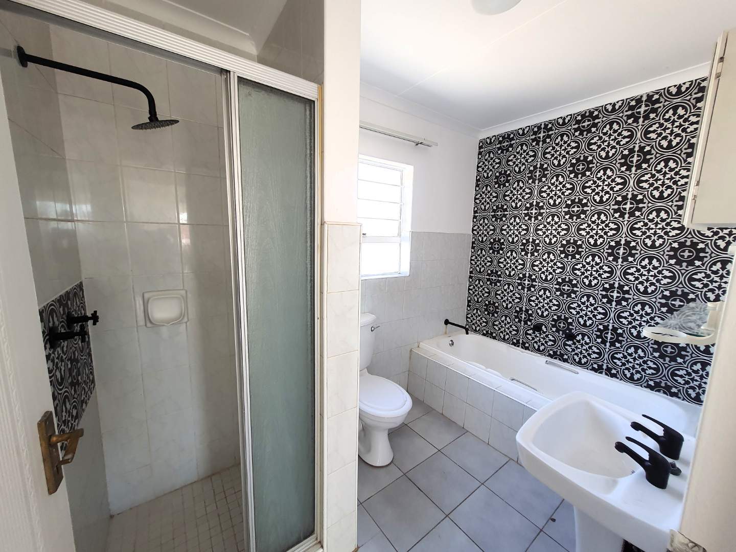 The bedroom is bright and sunny with fitted cupboards and overlooks the balcony. Across the bedroom, you will find the full bathroom featuring a bath and shower.