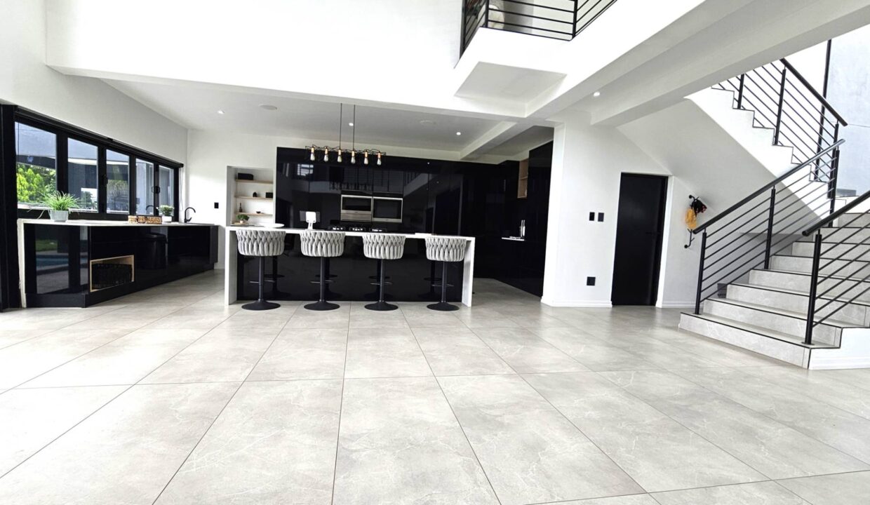 Spacious open plan double volume lounge, dining area, and exquisite kitchen with separate